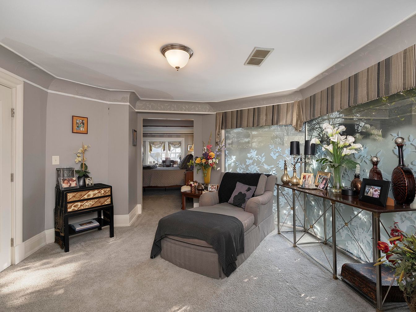 This cozy sitting area features soft gray walls and plush carpeting that enhances its welcoming ambiance. A comfortable gray chaise lounge is adorned with a cozy black throw, inviting relaxation. A sleek console table with an intricate design holds a variety of decorative vases and framed photos, showcasing personal touches. Flowers in elegant arrangements add a splash of color against the neutral backdrop. Large windows covered with stylish striped valances create an airy feel, while frosted glass panels provide privacy without sacrificing natural light. The subtle architectural details, including crown molding, add a touch of sophistication.