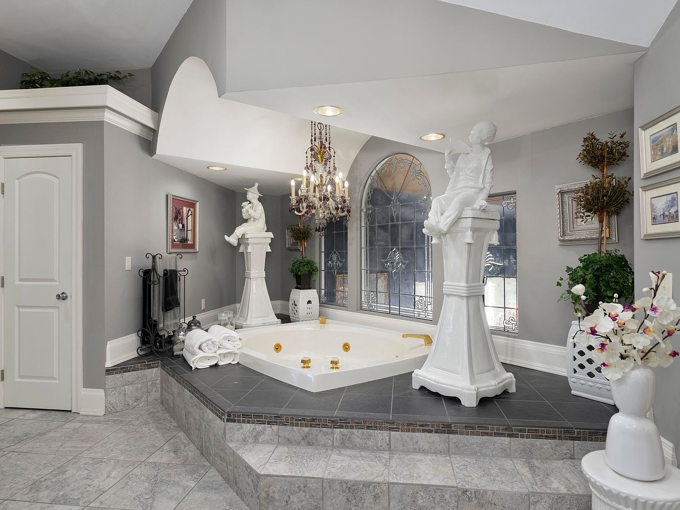 This opulent bathroom features a large, sunken whirlpool tub accented with gold fixtures. Gray walls create a sleek backdrop for the elegant decor, highlighting the double marble statues that elevate the space. A decorative chandelier hangs gracefully from the ceiling, providing ambient lighting. Black and gray tiles wrap around the bath area, enhancing the modern aesthetic while contrasting with white towels neatly arranged nearby. Framed artworks adorn the walls, complementing lush greenery placed strategically for a touch of nature. Large windows allow natural light to stream in, creating an inviting and serene atmosphere.