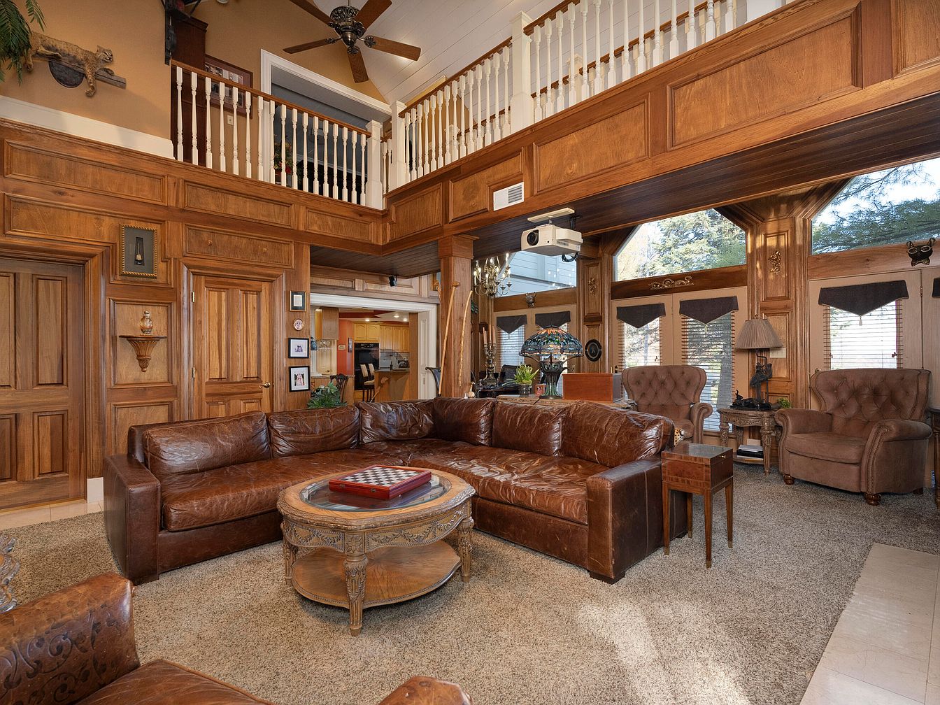 This spacious living room features rich wooden paneling and a high ceiling, complemented by a stylish balcony overlooking the area. The color palette incorporates warm browns and beiges, highlighted by plush leather furniture. A large, curved leather sectional sofa anchors the space, while an ornate wooden coffee table adds a touch of elegance. Two tufted armchairs sit across from the sofa, providing additional seating. Natural light floods through large windows adorned with stylish valances. Decorative details include a vintage lamp, wall art, and greenery, creating a cozy yet sophisticated ambiance that invites relaxation and conversation.