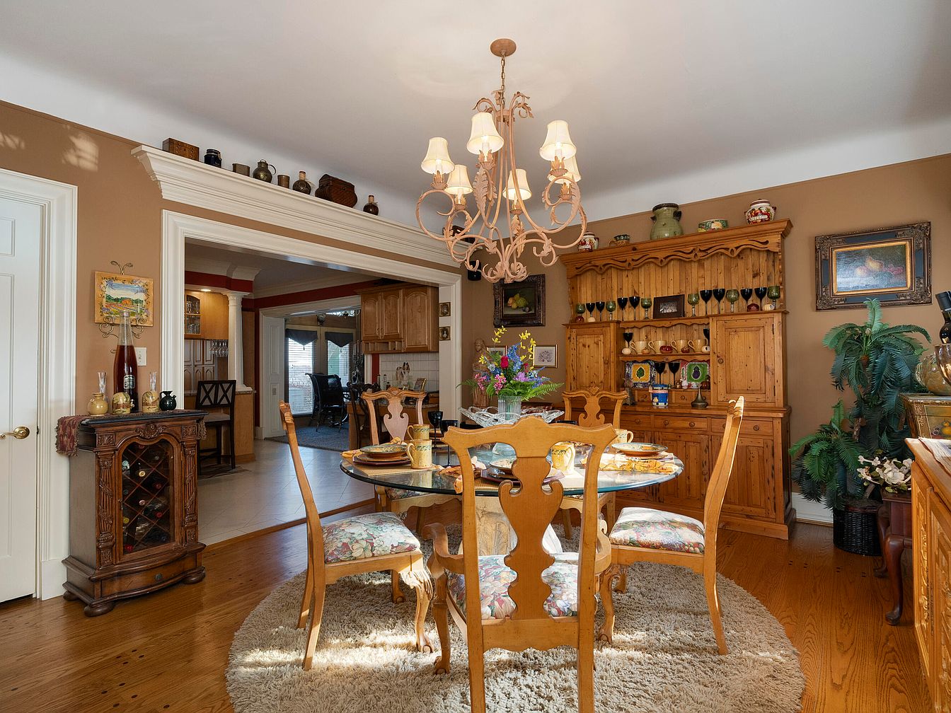 Showcasing a warm, inviting dining area characterized by a rich, earthy color palette of soft browns and creams. A round glass table, surrounded by intricately designed wooden chairs, dominates the center, with floral-patterned cushions adding comfort. Above, an elegant chandelier with soft light enhances the inviting atmosphere. To one side, a rustic wooden hutch displays an array of colorful ceramics, harmonizing with the decor. A plush, round rug underfoot adds warmth, while a nearby wine cabinet complements the vintage aesthetic. Decorative items and artwork adorning the walls contribute to a cozy, nostalgic ambiance.