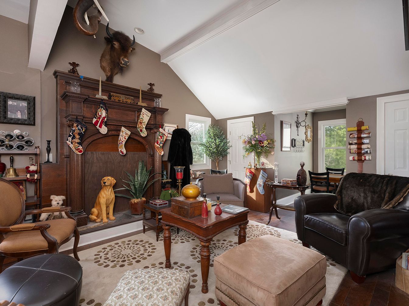 The living room features an eclectic mix of vintage and rustic design elements. A large wooden mantel dominates one wall, adorned with colorful stockings, and topped with a taxidermy bison head. Below, a carved wooden dog statue adds charm. The color scheme consists of warm browns and creams, enhanced by a plush, patterned area rug and an inviting armchair. Heavy drapes frame the windows, while greenery and floral arrangements add a fresh touch. A cozy leather sofa and a decorative coffee table complement the space, alongside various antique items that enrich the room’s character.