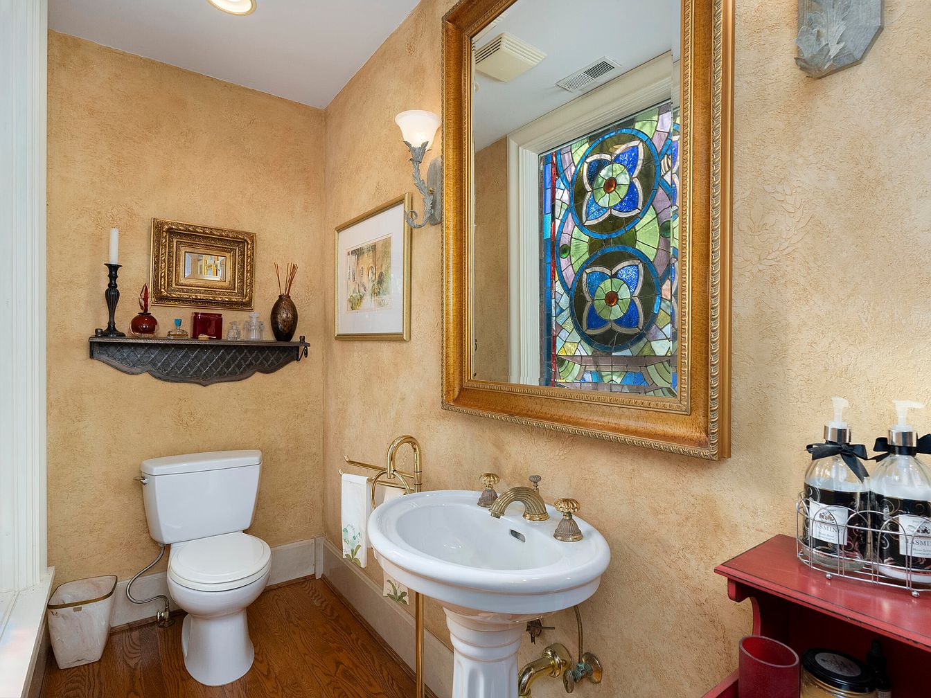 A quaint powder room features warm, textured walls painted in soft tan. A large ornate mirror framed in gold reflects light from a stylish wall sconces, adding elegance. A stained glass window showcases vibrant blues, greens, and reds, infusing color and personality into the space. A simple white toilet and a delicate pedestal sink balance the decor with their clean lines. Artwork and decorative items like vases sit atop a sleek black shelf, enhancing the room’s charm. Wooden flooring in warm tones complements the overall inviting atmosphere, creating a cozy, intimate space that feels both historic and contemporary.