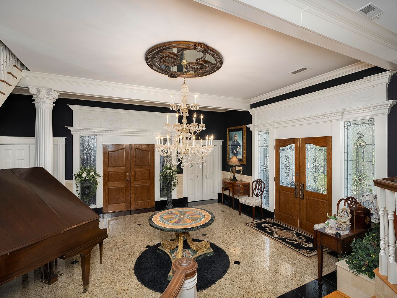 The entryway features a stunning design with a high ceiling adorned by an ornate chandelier that casts a warm glow. Double wooden doors with intricate stained glass invite guests in. Flanking the doors, tall columns contribute to the stately feel, while black walls contrast with the light-colored molding, enhancing the room’s sophistication. A grand piano sits in the corner, its polished wood complementing the decorative circular table in the center, featuring a colorful mosaic top. Plush rugs, elegant floral arrangements, and classic furniture pieces accentuate the graceful ambiance, creating a welcoming yet opulent first impression.