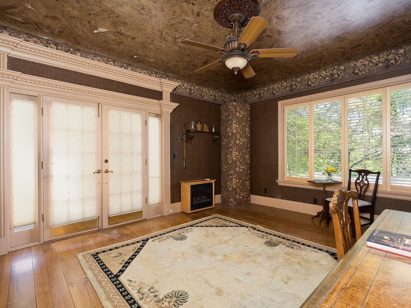 This study room features elegant architectural details, characterized by richly textured wallpaper and ornate crown molding. Natural light streams through large windows adorned with wooden slats, providing a view of the greenery outside. A dark wooden table contrasts with the light wood flooring, enhancing the room’s classic appeal. The centered area rug, displaying a delicate floral pattern, adds warmth to the space. A stylish ceiling fan hangs from the intricately designed ceiling, while the decorative wall panel houses a small shelf. Soft, muted colors contribute to a serene and inviting atmosphere, perfect for reading or reflection.