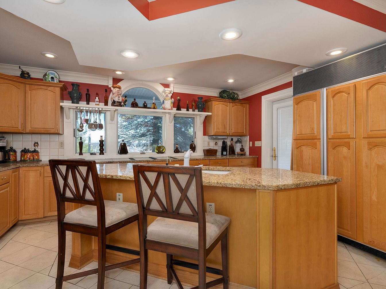 The kitchen features a spacious layout with warm wooden cabinetry and a contrasting granite countertop that enhances the inviting atmosphere. A central island serves as a focal point, complemented by two high-backed chairs with a unique crisscross design, ideal for casual dining or conversations. The soft beige tile flooring adds cohesion, while the red accent wall injects vibrancy into the space. Above the sink, an expansive window offers natural light and views of the outdoors. Decorative pieces, including bottles and playful figurines, adorn the open shelves, reflecting personal style and creating a homey vibe.
