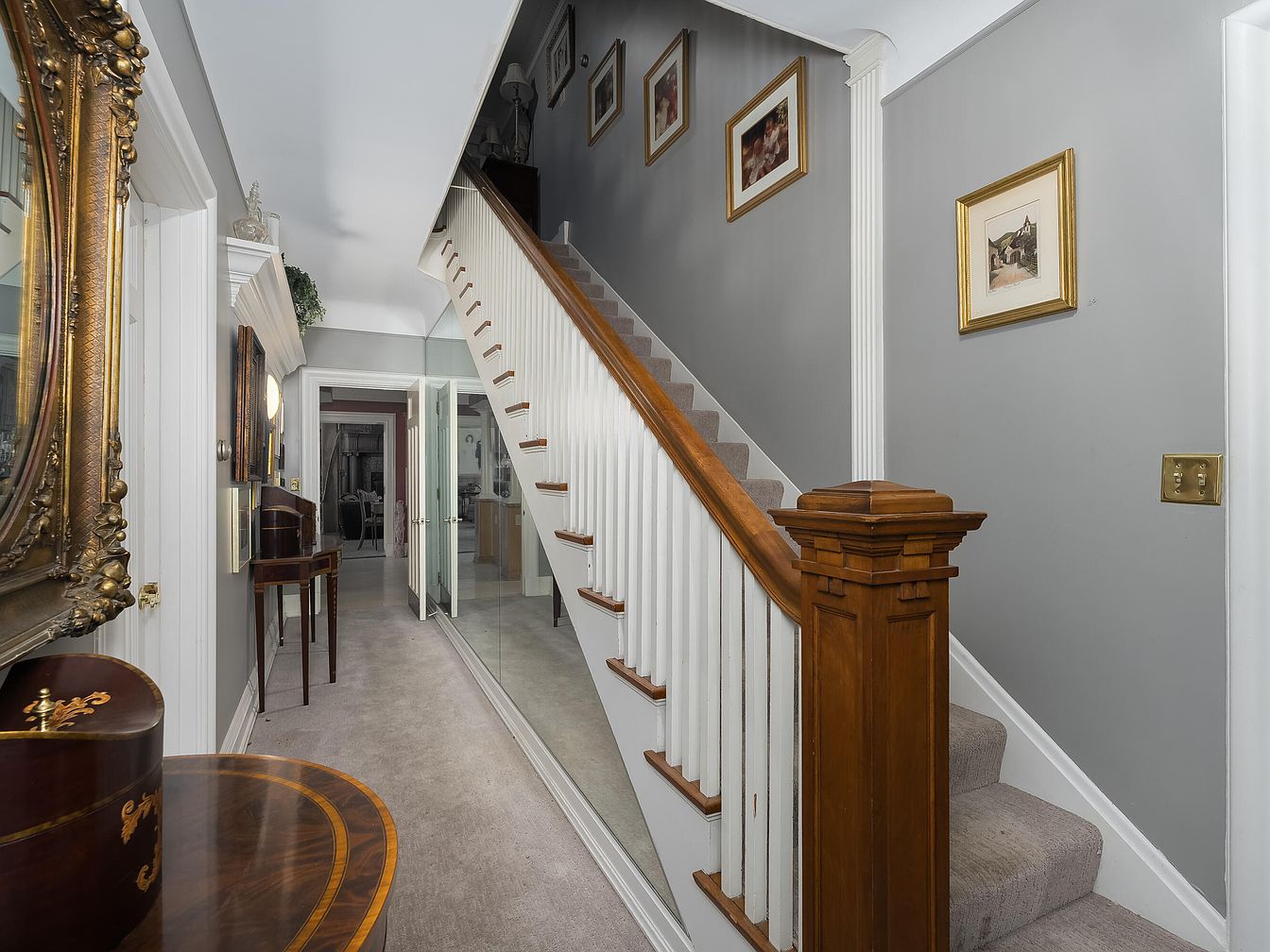 A welcoming hallway entrance features soft gray walls adorned with framed artwork. A polished wooden console table, delicately curved, stands opposite a large antique mirror, reflecting light and enhancing space. The staircase, bordered with white balusters and a wooden handrail, leads to the upper floor, its soft carpeted steps providing warmth. Elegant wall sconces illuminate the area, emphasizing the classic charm of the historic home. A glass-paneled door at the end provides glimpses into the adjoining rooms, creating an inviting flow throughout the space. The overall aesthetic harmonizes tradition with subtle modern touches.