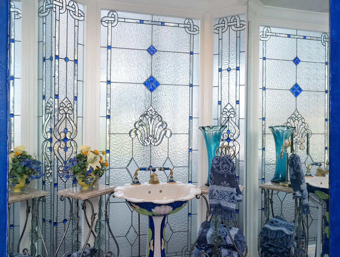 This elegant bathroom features intricate stained glass windows that blend artistic blue and clear glass, enhancing natural light. A porcelain pedestal sink, adorned with floral designs, serves as a striking focal point. Beside it, delicate glass vases in turquoise add a pop of color, complemented by a floral arrangement in a decorative bowl. The dark blue walls contrast with the light tones of the furnishings, creating a tranquil atmosphere. Stylishly arranged towels in varying shades of blue rest on ornate metal stands. The overall design conveys a timeless elegance, artfully merging functionality with aesthetic appeal.