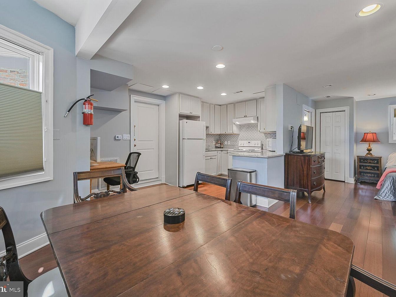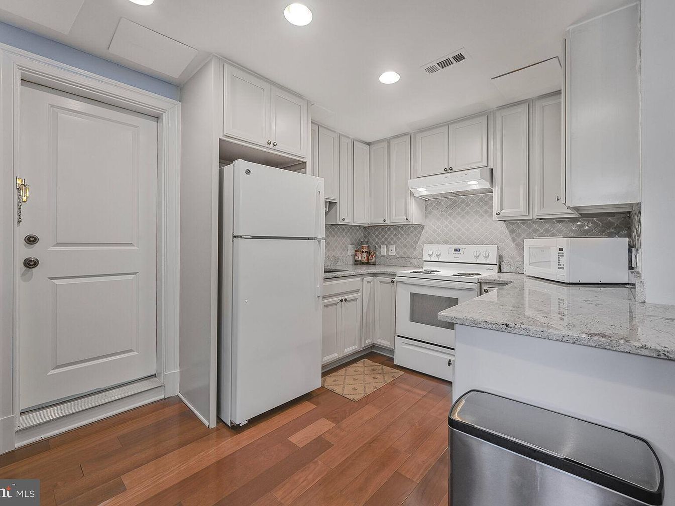 The kitchen features a seamless layout with light-colored cabinetry and modern appliances. White cabinets are complemented by a gray, diamond-patterned backsplash that adds texture and depth. A white refrigerator stands adjacent to the stove and microwave, creating a functional workspace. The sleek granite countertop enhances the space with natural beauty. Warm wood flooring contrasts the lighter hues, providing an inviting touch. Ambient ceiling lights illuminate the area, making it bright and cheerful. The entry door is painted in a similar white, maintaining a consistent and airy feel throughout the kitchen, perfect for both cooking and casual gatherings.