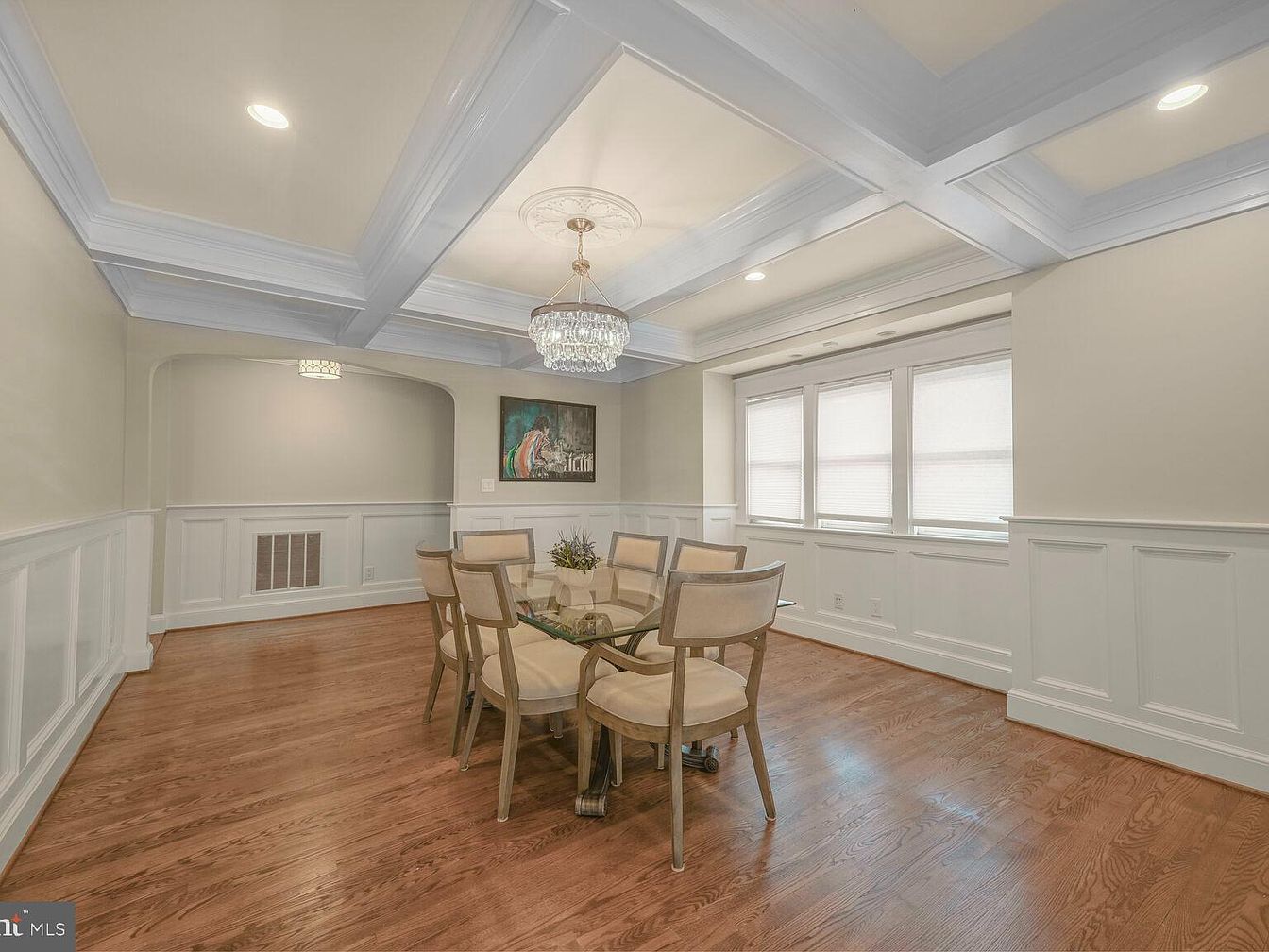 This dining room features an elegant design with warm wood floors contrasting against soft beige walls. The ceiling boasts a decorative coffered design, adding depth and sophistication. A crystal chandelier hangs centrally, illuminating the space. A round glass table is surrounded by six upholstered chairs with wooden frames, creating a welcoming dining area. The wainscoting along the lower part of the walls enhances the classic aesthetic. To the side, a large artwork and additional curved recess highlight the room’s charm. Sunlight filters through multiple windows adorned with shades, enhancing the inviting atmosphere.