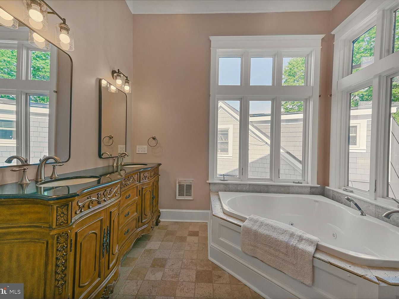 This elegant bathroom features a warm color palette of soft pink walls complemented by a classic wooden vanity with ornate detailing. The double sink setup includes polished chrome faucets, enhancing the vintage charm. Large windows frame the space, inviting natural light and offering views of the outdoors, reflecting the vibrant green foliage outside. The bathtub, placed next to the windows, provides a luxurious feel, surrounded by grey marble accents. The floor showcases a subtle tile design, adding texture beneath foot. Minimalist light fixtures above the mirrors provide soft illumination, underscoring the room’s refined aesthetics.