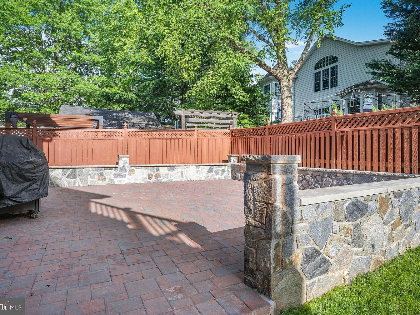 This outdoor patio features a spacious brick-paved surface, providing a warm and inviting space. Stone walls delineate areas, giving a rustic charm, while the red wooden fence adds privacy and vibrancy. A covered area hints at outdoor dining or relaxation, framed by a lush backdrop of green trees. The layout encourages outdoor gatherings, with ample room for furniture. The combination of natural stone, brick, and wood creates a harmonious relationship with nature. Sunlight filters through the surrounding foliage, enhancing the tranquil atmosphere, making it a perfect retreat for entertaining or unwinding.