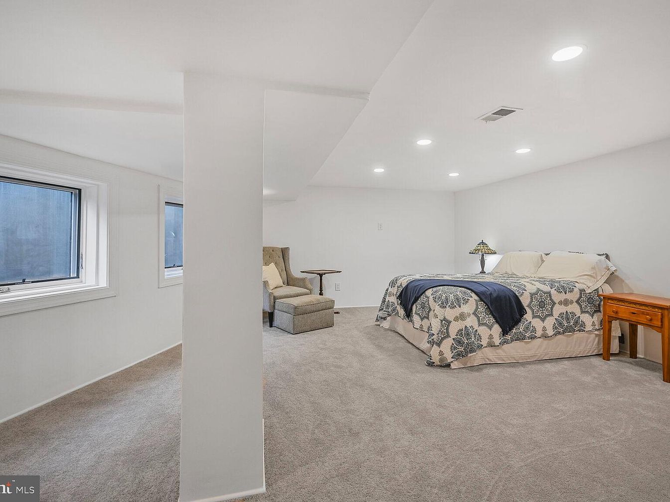 This spacious bedroom features a neutral color palette with soft gray walls and plush carpeting that enhances its cozy feel. The layout includes a comfortable bed adorned with intricate patterned bedding, complemented by a navy throw. Natural light enters through two well-placed windows, brightening the room. A small wooden nightstand with clean lines sits beside the bed, while a sleek side table holds a lamp with a stained glass shade. A cozy armchair invites relaxation, adding a touch of warmth to the minimalist aesthetic. Overall, the design balances functionality with serene elegance, ideal for restful nights.
