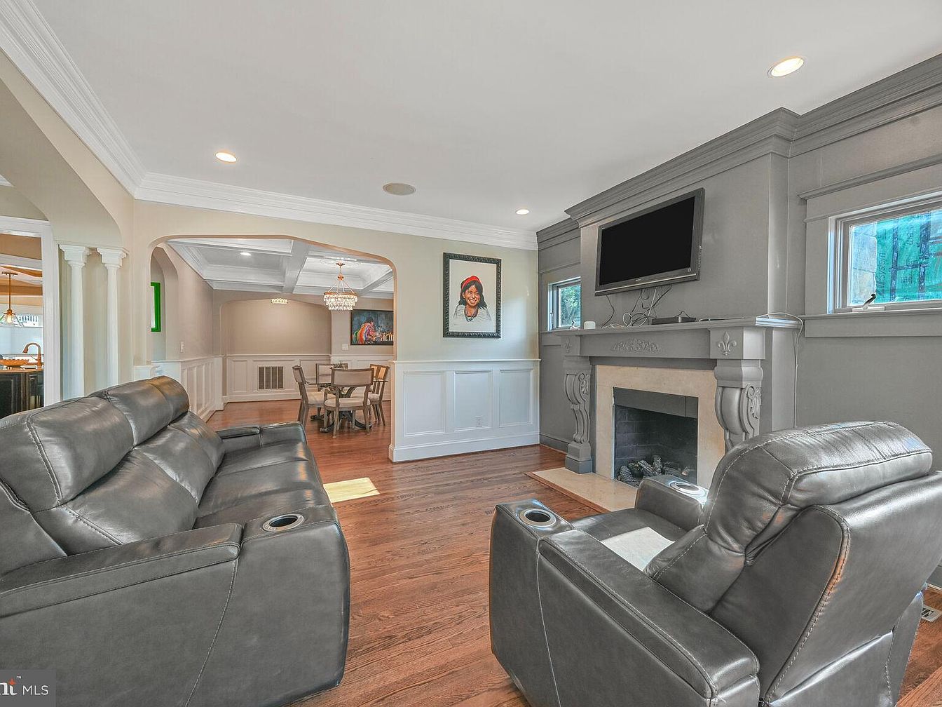 This cozy living room features plush dark gray recliners positioned around a classic fireplace with elegant white trim. The hardwood floor contrasts beautifully with the soft muted wall color, enhancing warmth. A large flat-screen television is mounted above the fireplace, blending modern technology with the room’s traditional elements. To the side, there’s an arched opening leading into a dining area, illuminated by a chandelier with a contemporary touch. Natural light filters through the windows, complementing framed artwork that adds character to the space. Crown molding and wainscoting contribute to the sophisticated aesthetic of the room.