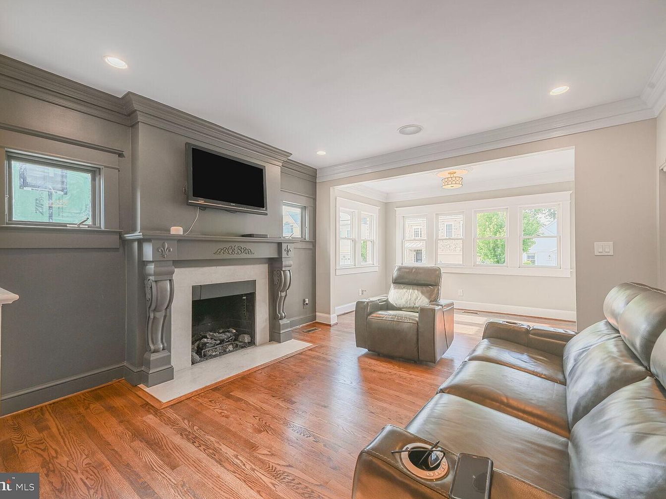 This cozy living room features a modern yet classic design. Dark gray walls create a warm ambiance, complemented by detailed molding and recessed lighting. A sleek, marble-faced fireplace serves as a focal point beneath the wall-mounted television. The polished hardwood floor adds elegance, while two comfortable leather recliners invite relaxation. Large windows allow ample natural light, enhancing the space’s airy feel. A stylish light fixture hangs from the ceiling, providing additional illumination. The layout encourages conversation, with seating arranged to foster an inviting atmosphere, making it perfect for entertaining or casual family gatherings.
