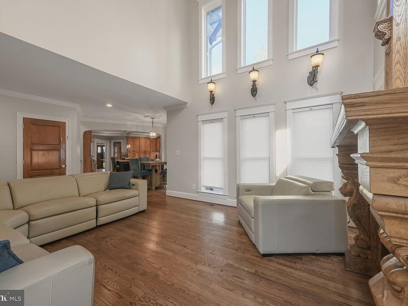 The living room features a contemporary design with an open layout, showcasing hardwood flooring that adds warmth. A modern, cream-colored sectional sofa contrasts with a rich wooden coffee table. Large windows allow ample natural light, creating an airy atmosphere, while wall sconces provide additional illumination. The walls are painted in a soft, neutral tone, enhancing the space’s brightness. Architectural elements include crown molding and a quaint fireplace with intricate wood detailing. A doorway leads to the adjacent kitchen, visible in the background, featuring wooden cabinetry and a pendant light, blending functionality with elegance.