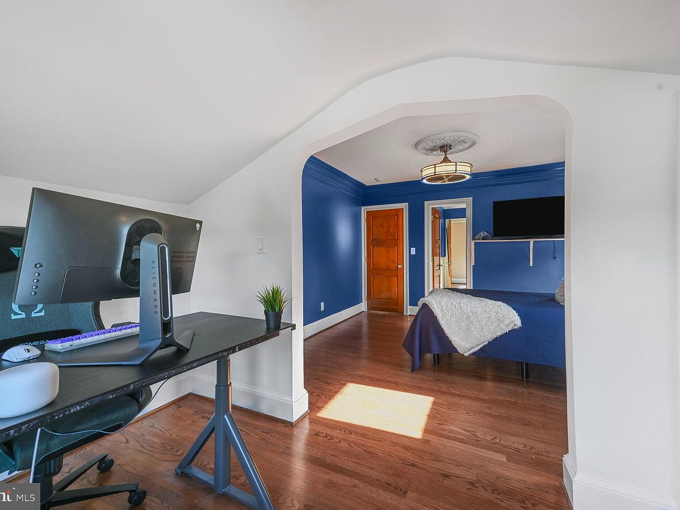 This space blends a cozy bedroom and a functional office area. The focal point is the deep blue accent wall, enhancing the serene atmosphere. A sleek black desk with a high-tech monitor and a gaming chair occupies one side, ideal for productivity. Natural hardwood flooring warms the room, while the light from a nearby window highlights its soft textures, including a plush throw on the bed. Architectural details like crown molding and a vintage light fixture add character. A wooden door contrasts beautifully with the blue wall and offers access to additional spaces, completing this inviting setting.