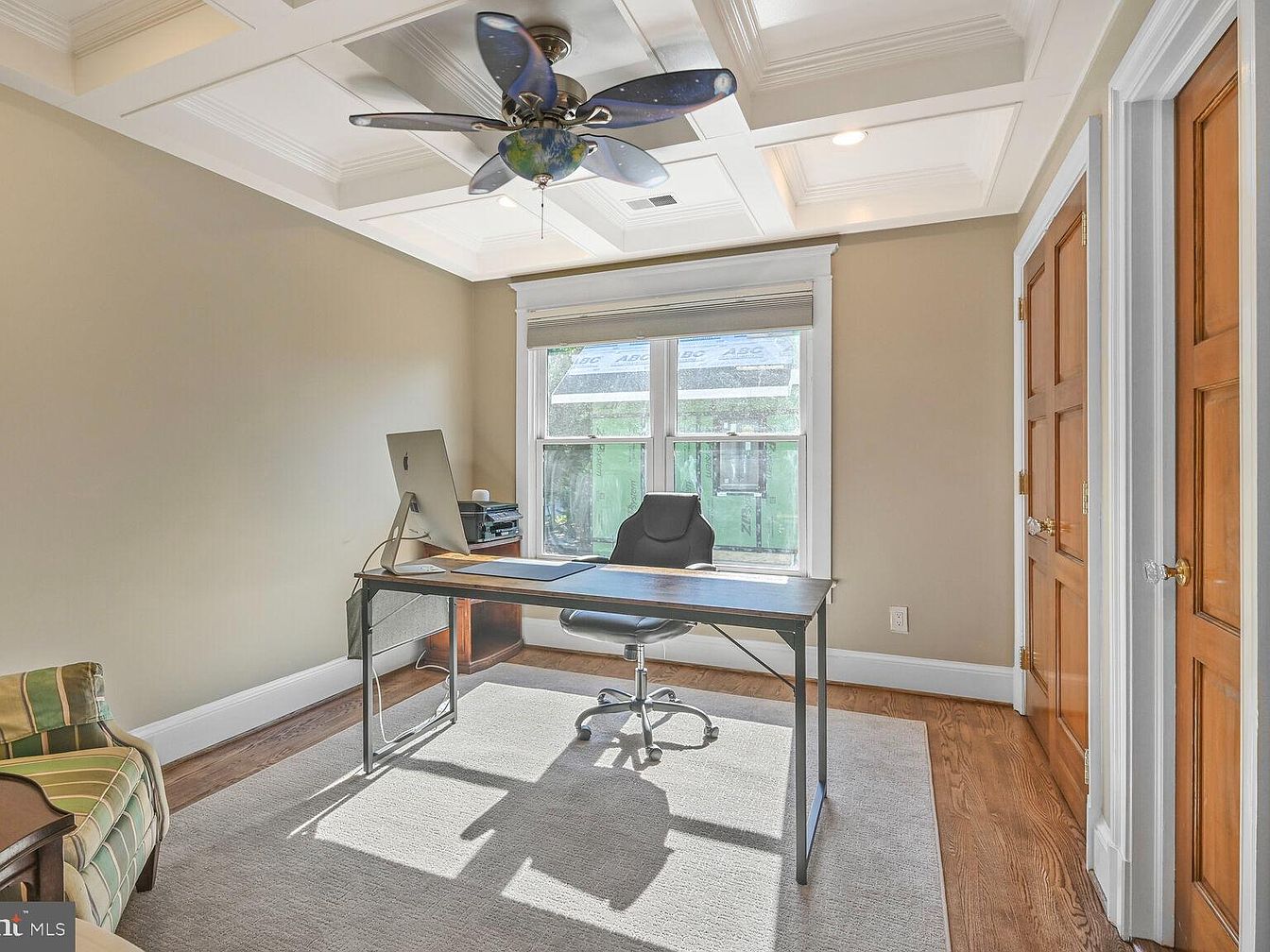 This home office features a clean, modern design with a light color scheme. The walls are painted a soft beige, complementing the warm wood tones of the floor and doors. A large window allows natural light to flood the space, enhancing visibility. The centerpiece is a sleek, glass-top desk paired with a comfortable ergonomic chair. To the left, a cozy, striped armchair adds a pop of color and serves as a reading nook. The ceiling showcases intricate coffered details, promoting elegance, while the plush area rug grounds the room, creating a welcoming atmosphere for productivity.