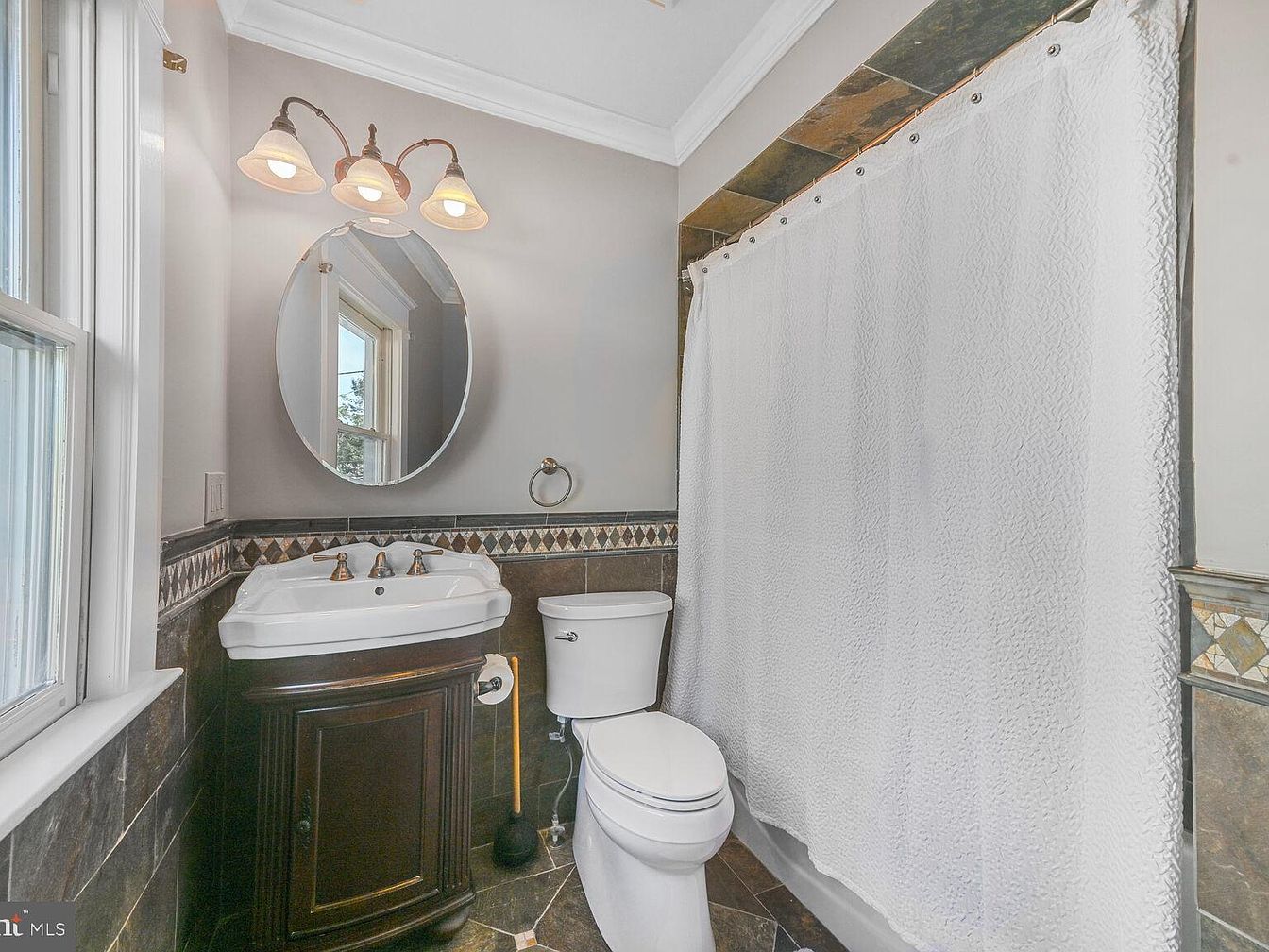 This bathroom features a blend of vintage and modern design elements. The floor is adorned with dark slate tiles, providing a striking contrast to the light gray walls. A chic oval mirror is mounted above an elegant, dark wooden vanity, which is paired with a traditional faucet featuring three knobs. The compact commode sits next to the vanity. Stylish wall sconces illuminate the space, casting a warm glow. A decorative tile border encircles the room, adding intricate detail. The shower area is enclosed by a crisp white curtain, enhancing the clean and serene atmosphere of the space.
