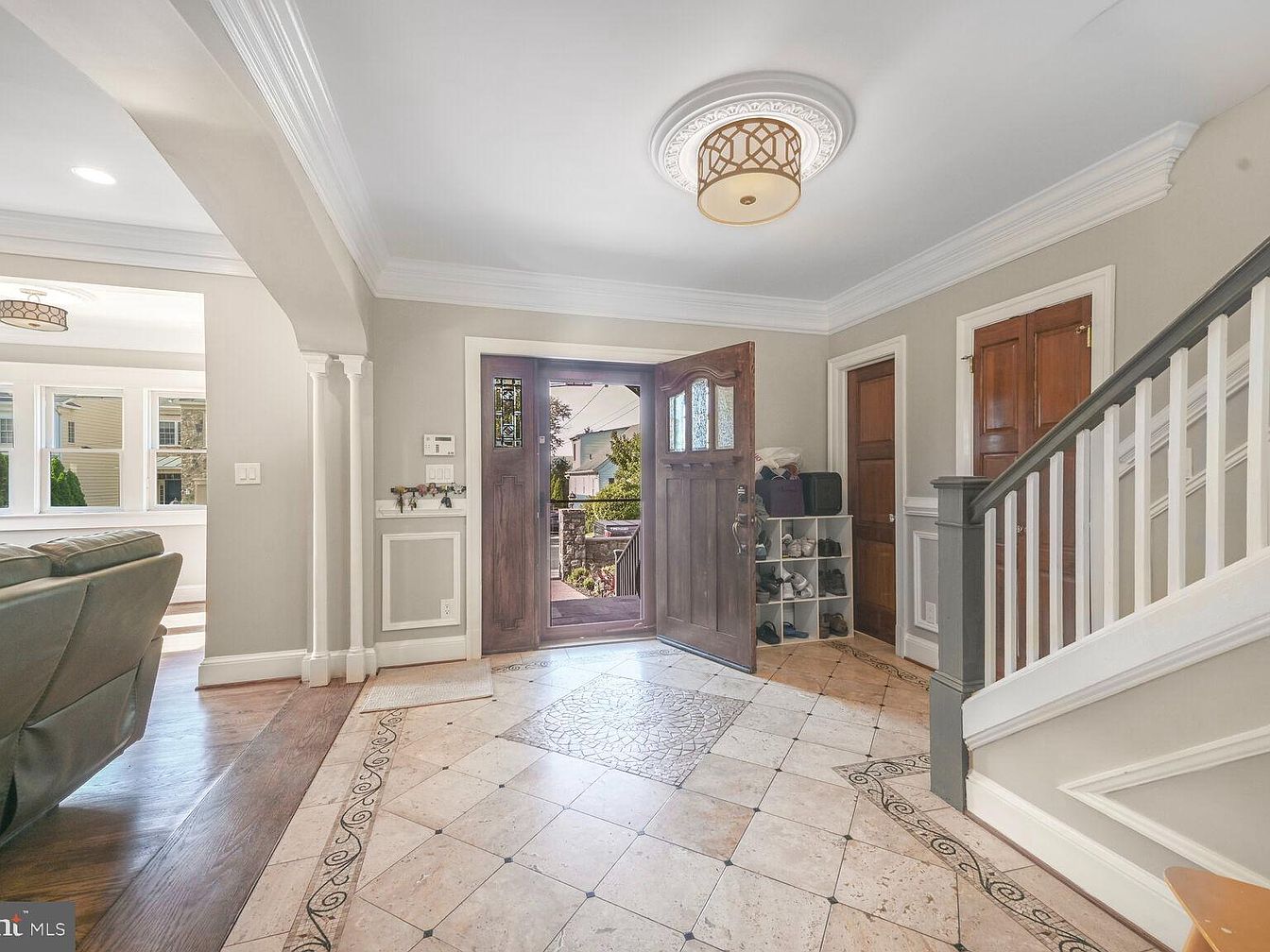 This entryway features a spacious layout with a blend of modern and classic elements. Beige walls complement intricate crown molding and a medallion ceiling light fixture, enhancing the inviting atmosphere. The flooring showcases patterned tile interspersed with warm wood accents, adding texture. To the left, large windows provide natural light, illuminating the area. A rich wooden door serves as the focal point, framed by a stylish sidelight. Opposite the entrance, a graceful staircase leads to the upper level, flanked by doors that suggest additional private spaces. Functional elements, like a shoe organizer, blend seamlessly into the design.