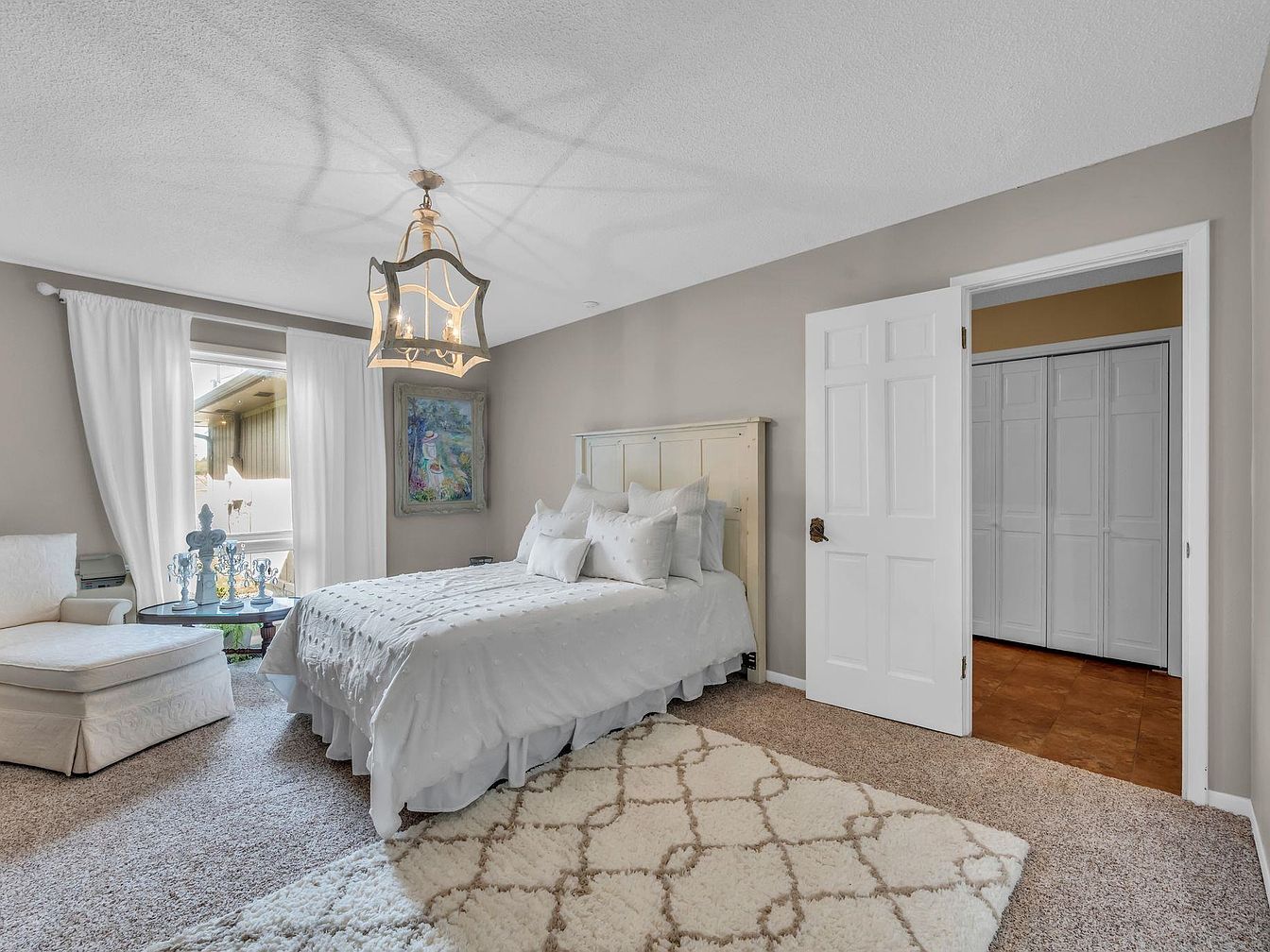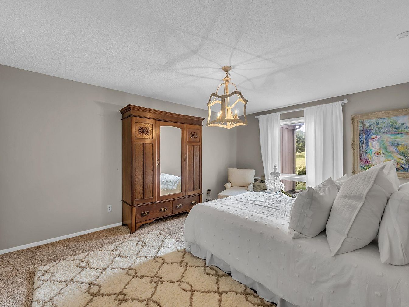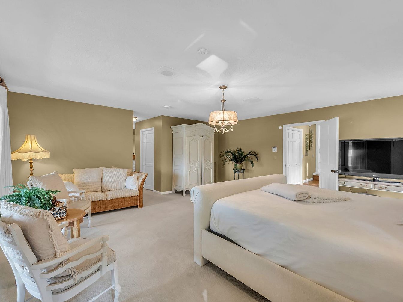 This spacious bedroom features warm beige walls and plush cream carpeting for a calming, classic atmosphere. A large upholstered bed with a low headboard takes center stage, neatly made up with light bedding and a folded blanket. To the left, a cozy seating nook is arranged with a wicker-framed loveseat, a vintage armchair, and a small round side table, all in soft neutral tones. An ornate cream armoire adds elegance, matched by an elaborate chandelier overhead. The room is illuminated by both natural light from large windows and a traditional floor lamp with a fringed shade, creating a welcoming, lived-in feel.