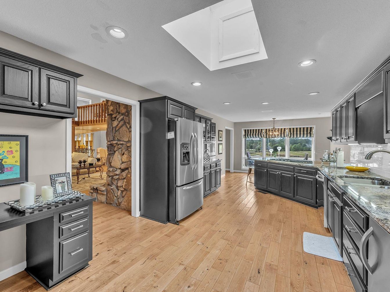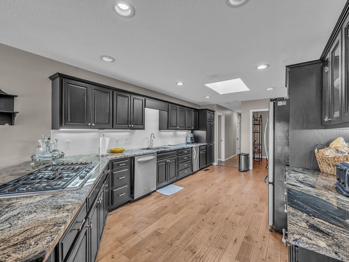 Spacious kitchen with a linear open-plan layout, featuring dark cabinetry offset by light granite countertops and chrome hardware. Warm wooden floors run lengthwise, creating a sense of continuity and comfort. Modern stainless steel appliances are built into sleek cabinets. A skylight and abundant recessed ceiling lights provide ample illumination. At one end, a large window with a striped valance overlooks greenery outside, inviting natural light into the dining alcove. A stone feature wall and wood railing at the adjoining room add rustic character and a visual bridge to the home’s historic charm. The overall effect is bright, inviting, and harmonious.