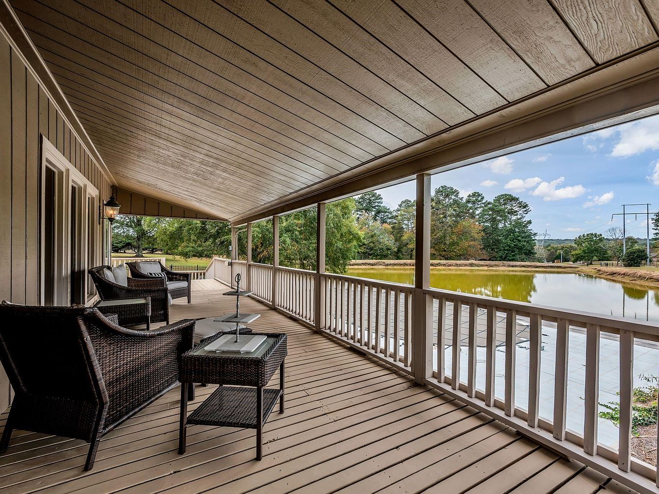 A spacious wooden porch features wide plank flooring and a ceiling of matching wood, creating a cohesive, inviting look. Three dark wicker seating arrangements, including armchairs and a small sofa, flank a glass-topped table and a side table. Cream-colored cushions add a touch of comfort. Soft beige railings line the outer edge, offering an unobstructed view of a tranquil pond surrounded by mature trees and grassy banks. The neutral palette of taupes and browns blends seamlessly with the natural outdoor scenery, while a single lantern sconce mounted by the entry adds a hint of understated historic charm.