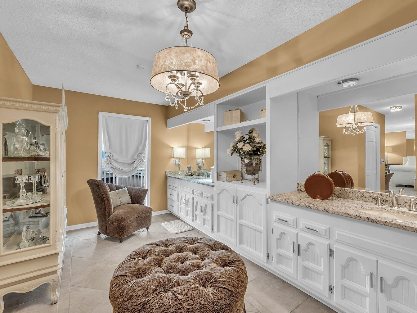 A spacious and elegant dressing area featuring warm tan walls contrasted with white cabinetry and trim. Built-in storage runs the length of one wall, with paneled cabinet doors, shelving, and a granite countertop. Decorative accents include a bouquet of flowers in a vase and a vintage suitcase atop the counter. A mirrored backsplash amplifies light and space, reflecting the pendant chandelier which adds a soft, glamorous glow. A tufted brown ottoman sits centrally, paired with an upholstered chair and matching accent pillows, creating a cozy spot. A glass-front curio cabinet displays fine silverware, adding to the sophisticated, vintage-inspired atmosphere.