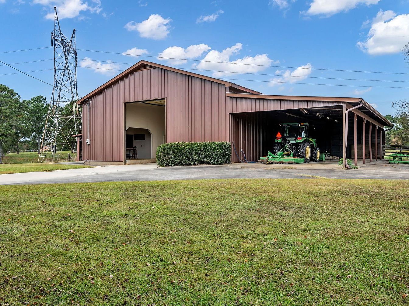 A large brown metal shed stands with an attached covered awning, sheltering a green tractor and additional farm equipment. The structure features a spacious open garage door and a side opening, with neatly maintained landscaping including a manicured hedge against the front. Overhead, power lines and a tall metal utility tower loom, emphasizing the rural and functional character of the property. The shed sits on a concrete pad, leading out to a wide expanse of green grass bordered by trees. The overall look is utilitarian, blending farm utility with careful maintenance and open surroundings.