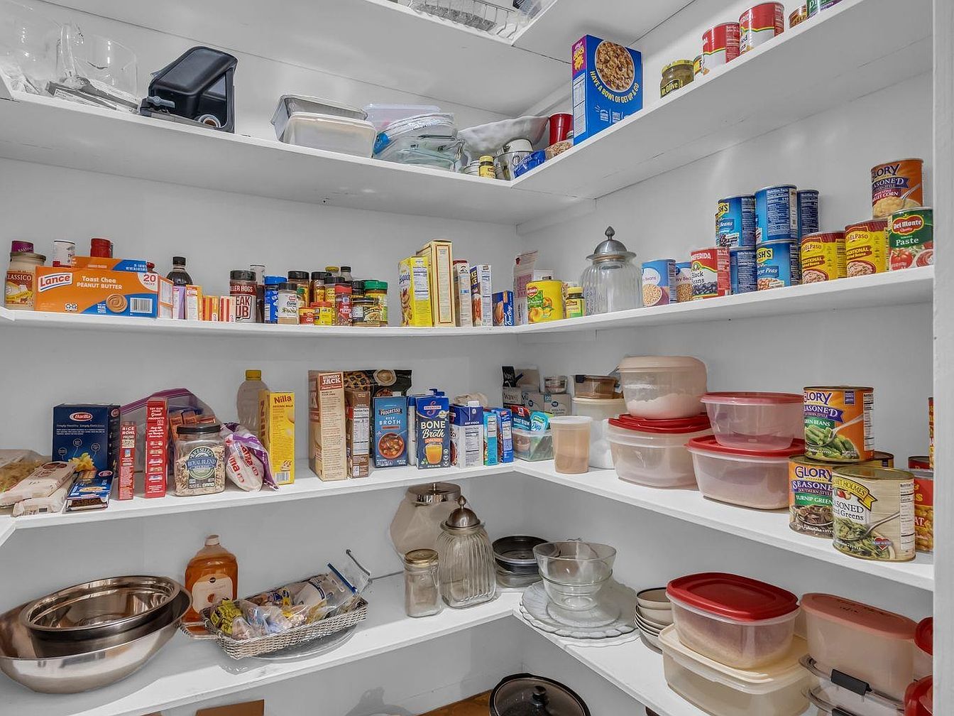 A spacious walk-in pantry features white-painted wooden shelves arranged in an L-shaped layout covering two walls, creating plenty of storage. The shelves are stocked with a variety of canned goods, boxed foods, jars, packaged snacks, and food storage containers with red lids. The lower shelves display stainless steel mixing bowls, glass jars, and kitchen essentials. The overall look feels orderly and functional, with a casual charm rooted in practical everyday living. The clean white color scheme gives a fresh, bright, and tidy appearance, allowing the colorful packaging of food items to stand out against the background.
