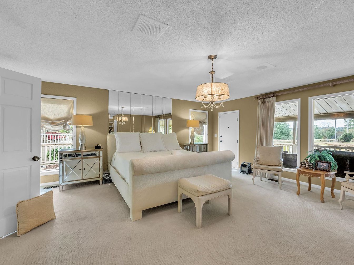 A spacious master bedroom is filled with soft natural light through large windows, revealing a serene view of the outdoors. The bed, with its high upholstered headboard and plush white linens, takes center stage on a light beige carpet. Mirrored panels create depth along the accent wall behind the bed, reflecting a sophisticated chandelier. Matching mirrored nightstands with elegant lamps flank the bed. To one side, two classic armchairs with light upholstery and a wooden end table offer a cozy sitting area. The overall aesthetic combines warm tan walls and neutral furnishings with subtle traditional touches for a calm, inviting atmosphere.