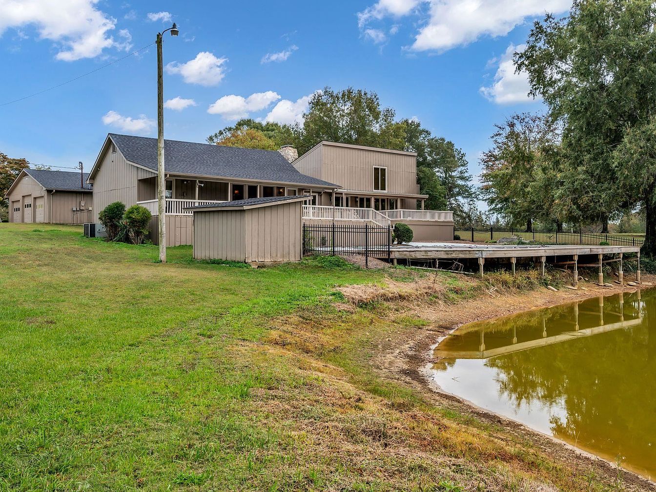 A spacious backyard featuring a large wooden deck overlooking a small pond, bordered by a black metal fence for safety. The house has taupe vertical wood siding and a dark shingled roof, blending with the earth tones of the landscape. There’s a separate detached garage on the left, and a small utility shed sits adjacent to the house. Mature trees and trimmed bushes provide natural greenery around the property. The open sky with scattered clouds enhances the serene, rural setting, and the property’s gently sloping lawn meets the edge of the reflective water, emphasizing a peaceful, natural atmosphere.