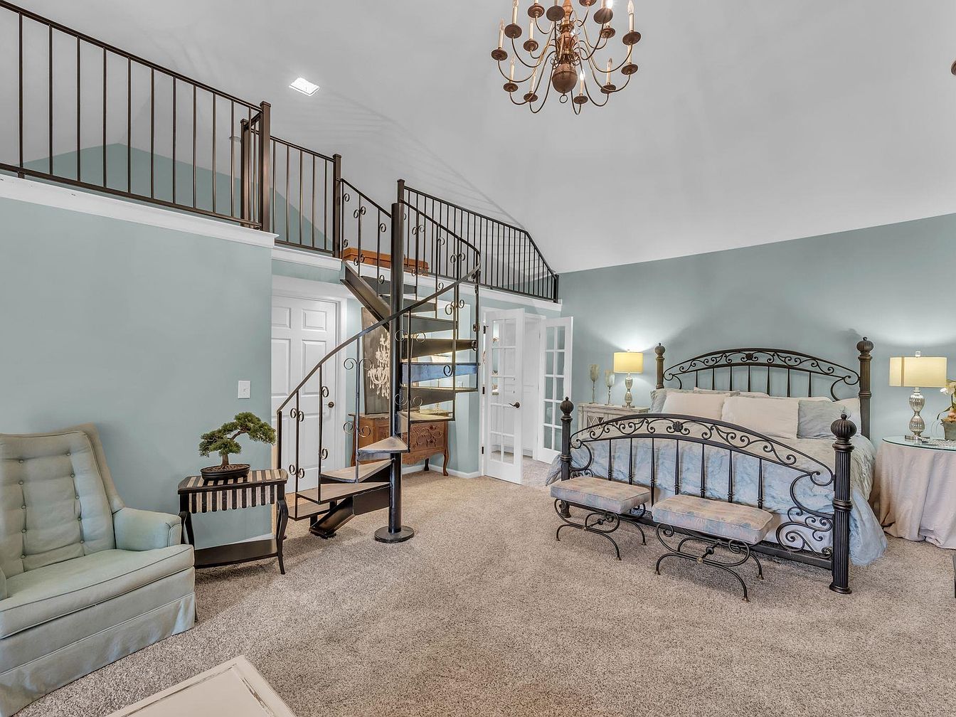 A spacious bedroom featuring a soft blue color palette on the walls, crisp white ceiling, and plush beige carpeting. A wrought-iron king-sized bed is positioned against the largest wall, framed by matching bedside tables and elegant lamps. Two cushioned benches with metal legs sit at the foot of the bed. To the left, a pale blue tufted armchair and a small striped table with a bonsai tree add a cozy touch. A dramatic spiral staircase with decorative metal railings leads up to a loft space, emphasized by vaulted ceilings and a large, ornate chandelier as a focal point overhead.