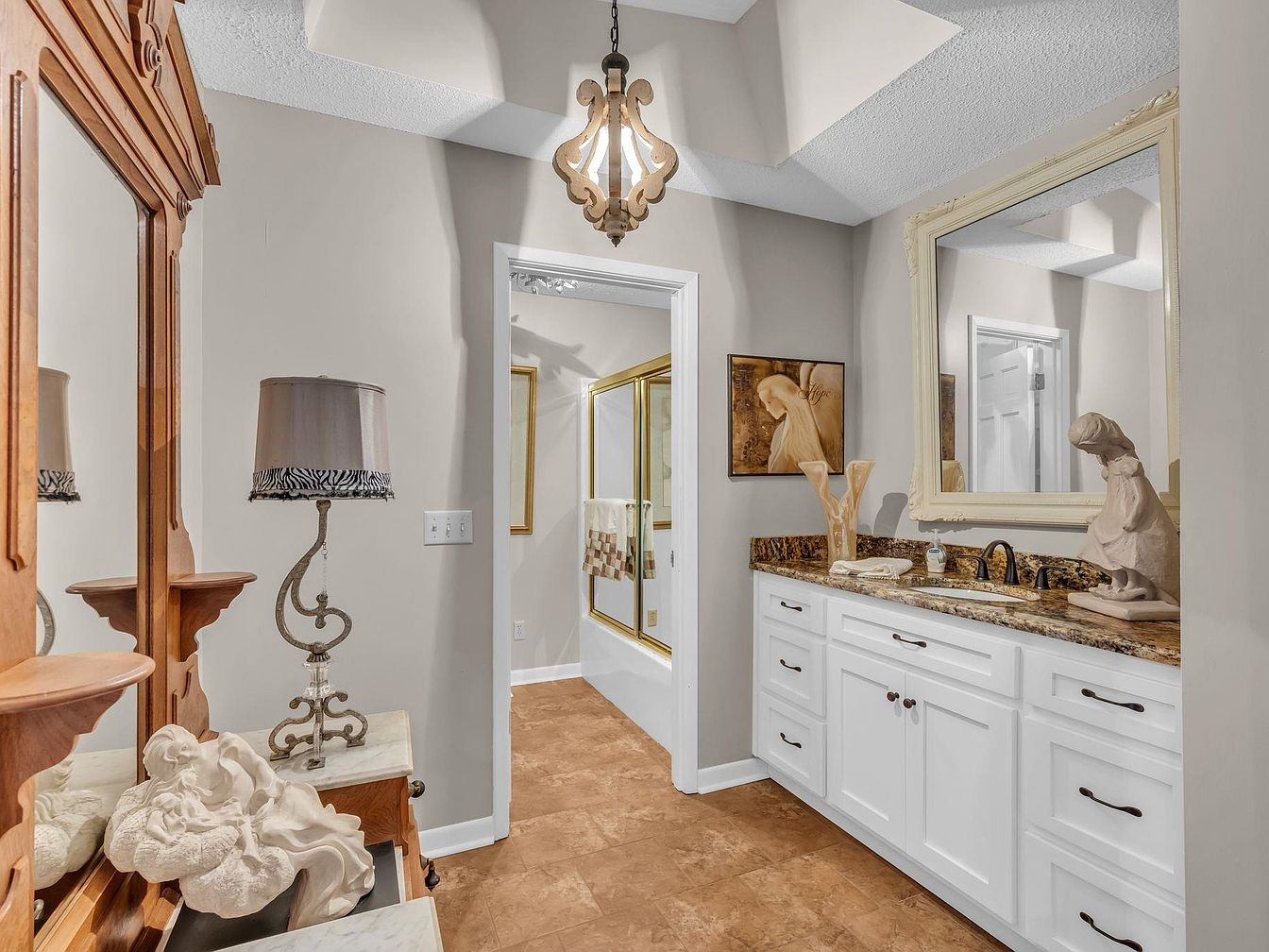 A spacious bathroom features a long white vanity with multiple cabinets and drawers, topped with speckled brown granite countertops. A large, decorative mirror with a cream frame hangs above the counter, reflecting warm lighting from a sculptural ceiling fixture. The space is styled with ceramic figurines, a decorative lamp with a curled metal base, and artistic wall art in sepia tones. The floors are finished with brown tiles, enhancing the earthy feel. Neutral beige walls and a tray ceiling add subtle elegance, while gold-trimmed shower doors and white baseboards finish the look with classic sophistication.