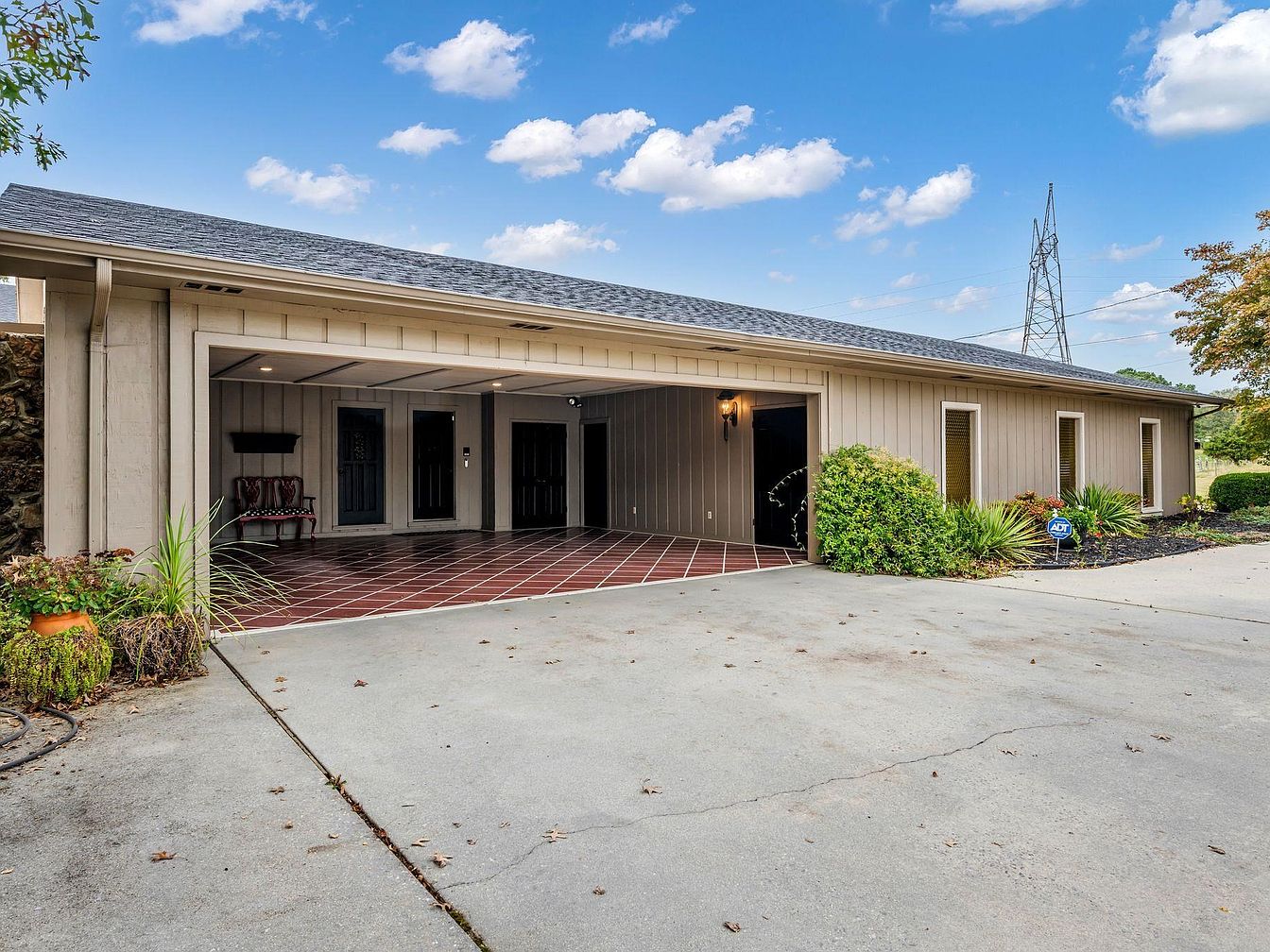 A spacious covered carport with a sloped roof, supported by beige vertical wood paneling, stretches along the side of the house. The floor is paved with deep red tiles arranged in a diagonal grid pattern, creating a distinct visual contrast against the neutral siding. To the left, a decorative bench adds a welcoming touch, framed by black exterior doors with glass panels. Small bushes and potted plants line the edges, softening the straight lines with greenery. The clean concrete driveway leads directly to the carport, with ample space for parking. Overall, the space combines functionality with understated curb appeal.