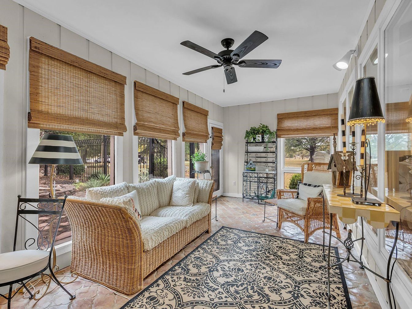 A bright sunroom features large windows lining one wall, dressed with natural bamboo shades that diffuse soft daylight. The room has a relaxed, inviting atmosphere with rattan furniture including a substantial wicker sofa and matching armchairs outfitted with cozy cream cushions. A patterned area rug with classic motifs sits atop terrazzo-style flooring, anchoring the seating area. The walls are a light taupe with vertical paneling, complemented by a simple black ceiling fan for airflow. Decorative elements include a striped table lamp, a slim console with a black shade, iron side chairs, and a potted plant on a wrought iron shelving unit, adding life and eclectic charm.