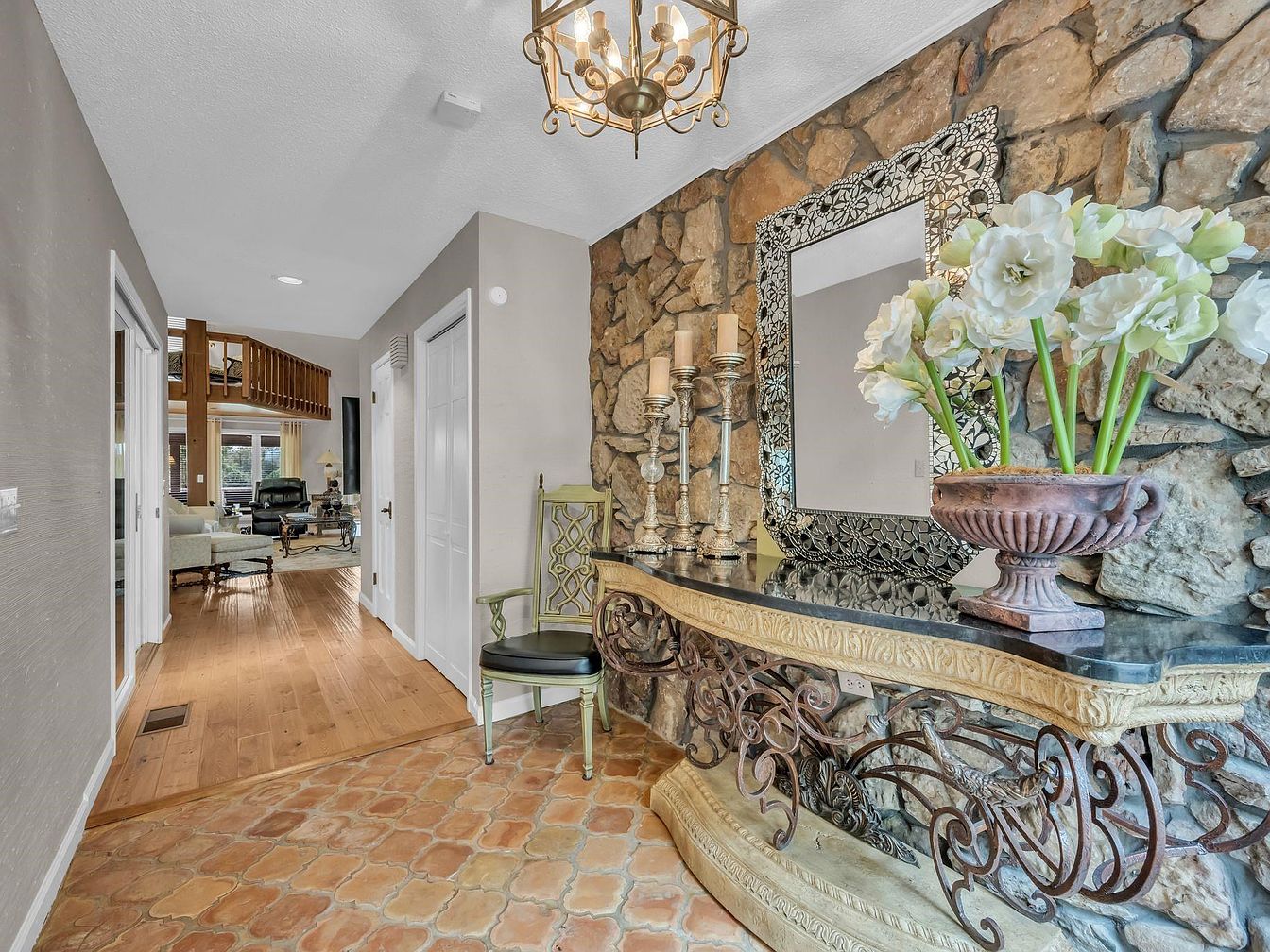 A welcoming entryway featuring a rustic stone accent wall adorned with an ornate mirror framed in silver and intricate details. Below the mirror sits an elaborate console table with a black stone top, richly decorated legs, and gold accents. A terra cotta tiled floor transitions smoothly to warm-toned hardwood leading toward a bright living space. The entry is furnished with a pale green chair with elegant designs, while a classical urn overflowing with white flowers brings a fresh, inviting touch. Multiple tall candlesticks contribute to the old-world, opulent charm, and a gold chandelier above offers soft overhead light.