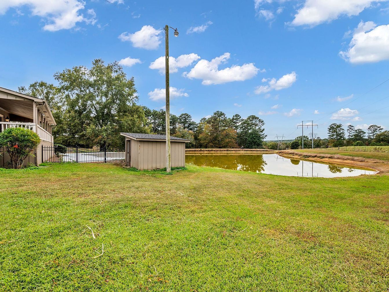 Expansive grassy backyard featuring a small, man-made pond bordered by natural earth along its rim and reflecting the trees and sky above. On the left, a beige wooden shed with a black shingled roof stands near a simple black metal fence that encloses part of a raised porch connected to the main house. Mature trees and utility poles line the background, with rolling fields stretching beyond. The overall aesthetic blends rustic charm with natural, open landscape elements, creating a serene and welcoming outdoor living environment immersed in greenery and framed by clear blue skies and soft clouds.