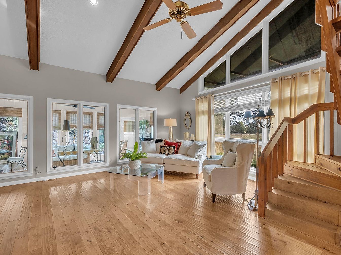 Spacious living room with a vaulted ceiling featuring exposed wooden beams and a central ceiling fan. Natural light fills the space through large windows with sheer beige curtains, highlighting the honey-toned wood floors. A modern glass coffee table sits atop the open floor, paired with a white chaise lounge and two matching armchairs, accented by a red pillow and soft throws. The staircase on the right has sturdy wooden steps and railings matching the floors. An adjacent sunroom, visible through four interior windows, adds to the airy ambiance, while potted plants and warm lighting create a cozy, welcoming atmosphere.