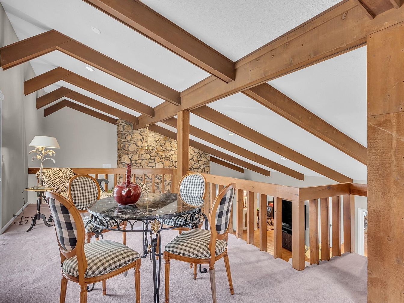 A spacious loft area with an open railing overlooks the floor below, featuring large exposed wooden ceiling beams and a light neutral carpeted floor. At the center sits a small round wrought-iron table with a marble top, surrounded by four classic check-patterned upholstered chairs with wooden frames. A statement red glass vase sits atop the table. In the background, a floor lamp with a decorative base and an animal print chair create a cozy nook. The far wall is finished in large, natural stone masonry, adding a rustic element to the mid-century modern feel of the space.