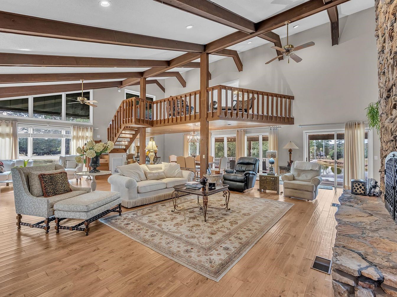 A spacious living room features soaring ceilings with exposed dark wooden beams and a lofted area above, accessible by a wooden staircase. The room is arranged with multiple cozy seating areas, including pale upholstered sofas, patterned armchairs, and recliners, all centered around a light, intricately patterned rug. The stone fireplace on the right adds rustic character, while large windows and sliding glass doors along both walls flood the open-plan space with natural light. Neutral tones dominate, accented by decor elements such as a floral arrangement, lamps, and traditional wooden furnishings, creating a warm, inviting atmosphere.
