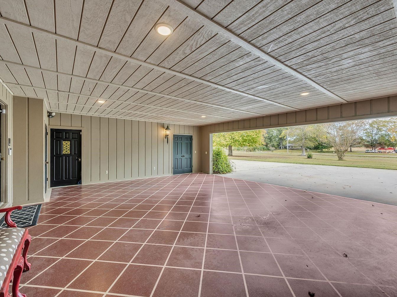 Spacious covered carport with a pink-tinted, grid-patterned tile floor and paneled beige walls, offering a sheltered transition from outdoors to indoors. Three doors, painted black and blue-gray, are spaced along the wall, providing access to the interior of the house. The ceiling features wooden beams in a geometric pattern, painted to match the walls, and is fitted with recessed lighting, creating a well-lit, functional space. One side is open to a wide, paved driveway and expansive green lawn, allowing natural light and views of mature trees. A red bench with polka-dot cushion sits in one corner, adding a welcoming touch.