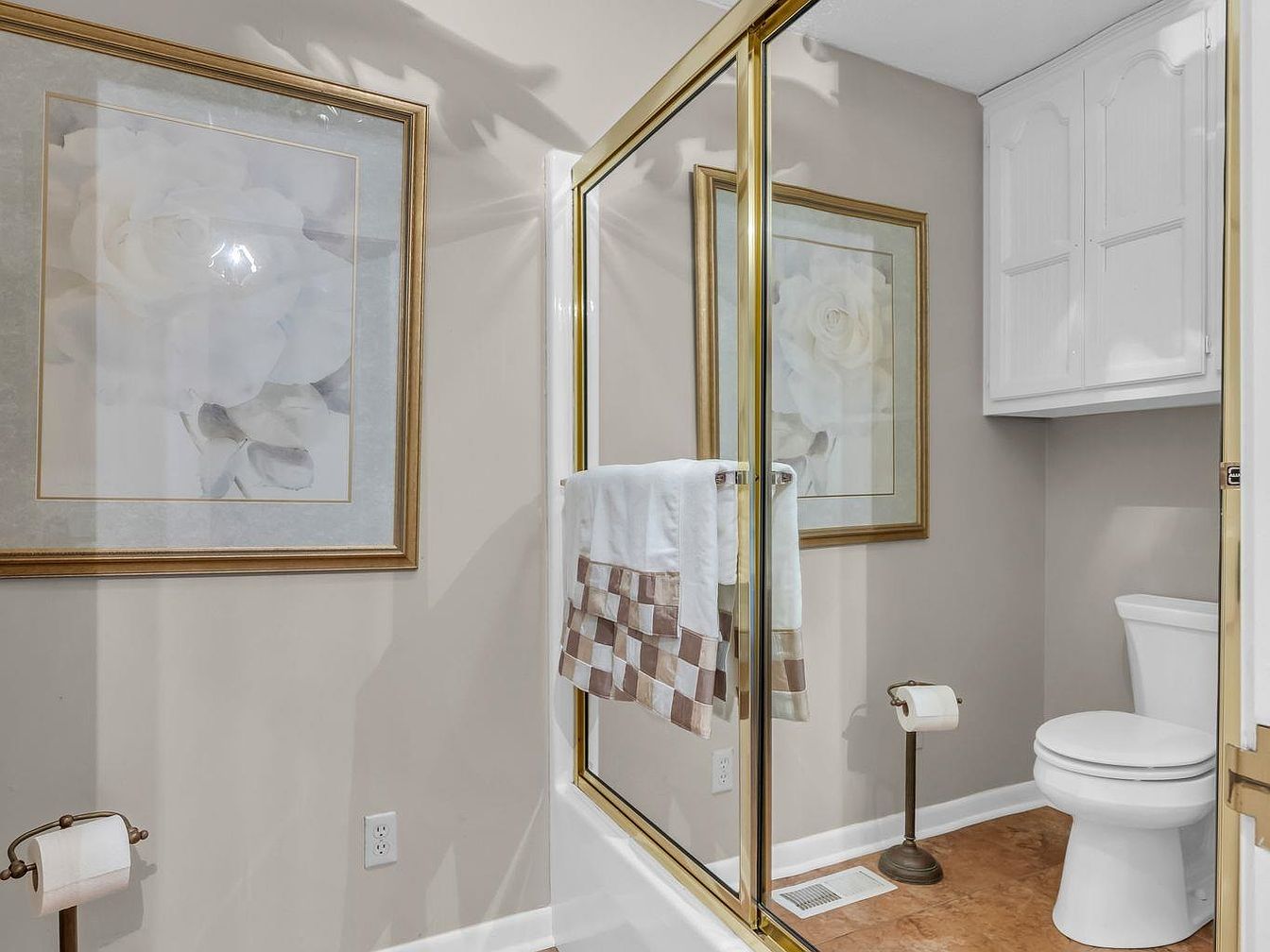 Soft beige walls create a calm atmosphere, complemented by a large, delicate floral painting framed in gold. The bathroom features a white toilet positioned underneath built-in white cabinetry with ornate doors for storage. A sliding glass shower door with gold trim adds a subtle touch of vintage elegance. A pair of matching towel racks and toilet paper holders in brass tones accentuate the cohesive look. The floor appears to be a warm-toned material, adding contrast to the neutral palette. Natural light adds brightness, highlighting the clean, tidy, and understated design choices in this modest bathroom space.