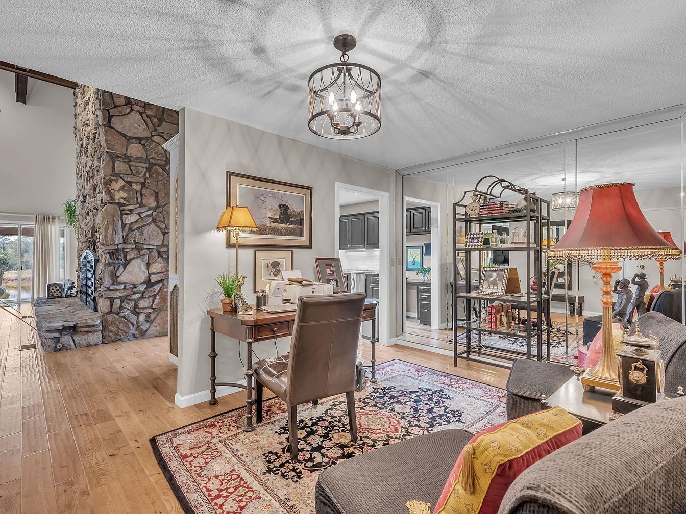 A cozy study area with a vintage ambiance features a dark wood writing desk paired with a tufted leather chair on an ornate Persian-style rug. Warm lighting from a table lamp and a red-shaded lamp on a nearby side table adds a welcoming glow. One wall is covered with floor-to-ceiling mirrors, visually expanding the space, while a powder-gray patterned wallpaper provides subtle texture. The decor displays framed art, personal photos, and small potted plants. Hardwood floors extend into an open hallway with a dramatic, rustic stone fireplace and built-in hearth seating, complemented by soft natural light from large sliding glass doors.