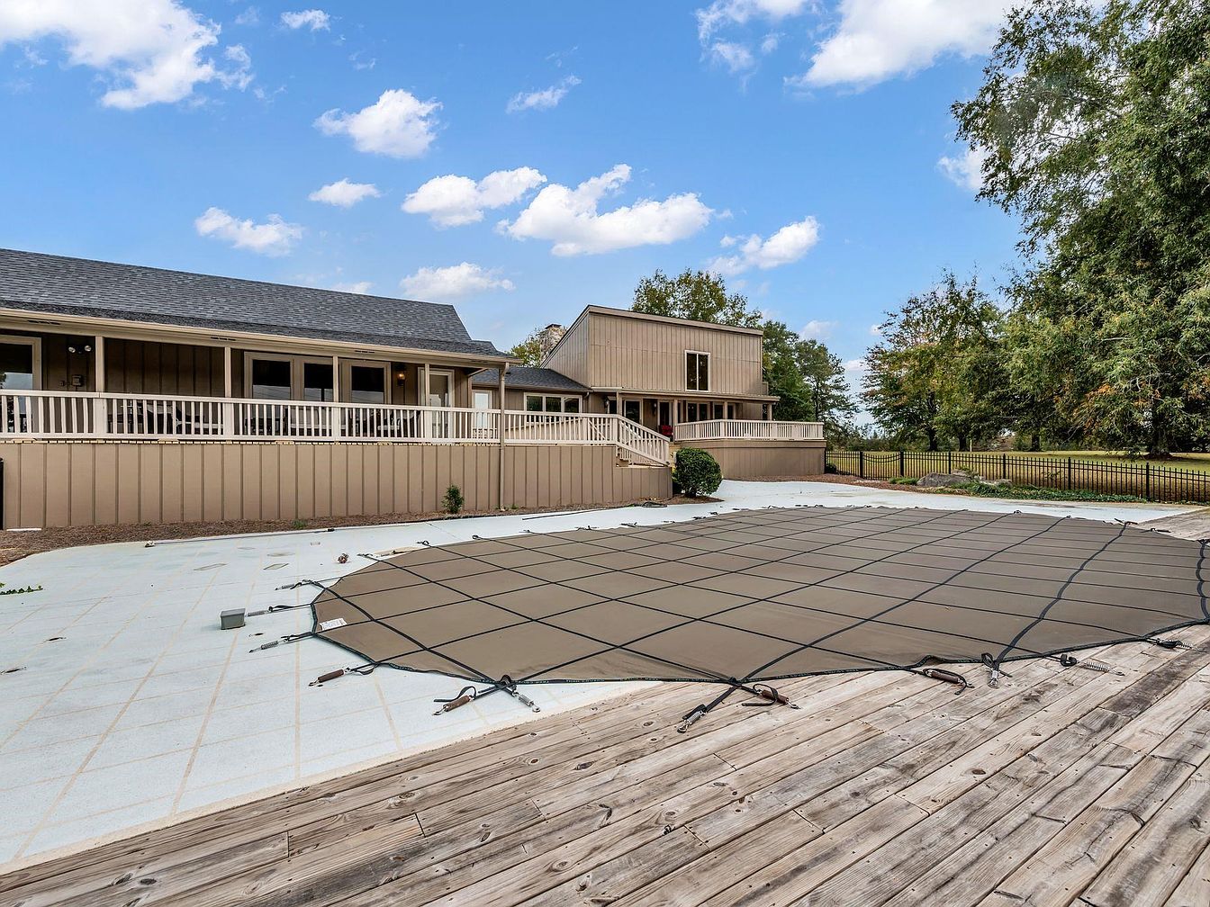 A large outdoor space featuring a covered swimming pool with a sturdy safety cover stretched and fastened across it dominates the center. Surrounding the pool is a generous pale concrete surface, bordered by a weathered wooden deck in the foreground, adding rustic charm. The house, painted in a muted tan, features classic board-and-batten siding and a wrap-around porch with white railings, visually extending the home into the yard. Mature trees, manicured shrubs, and open green lawns form the natural backdrop, creating a peaceful rural atmosphere. The design highlights functionality and welcoming outdoor living.