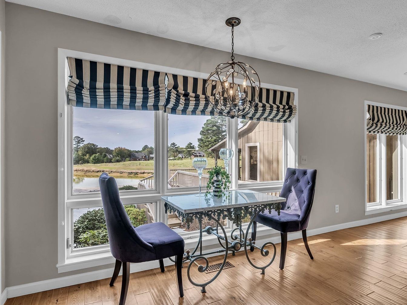 A small, sunlit dining area highlighted by three large windows that offer sweeping views of a serene yard and water beyond. The decor features a sophisticated color palette with light gray walls and warm honey-toned hardwood floors. Two deep blue tufted chairs rest around a delicate wrought iron and glass-top table, topped with clear glass vases and green accents. Window treatments are mounted Roman shades with bold navy and white stripes, adding a touch of nautical elegance. Overhead, a spherical metal chandelier with exposed bulbs provides a modern, decorative focal point for the cozy space.