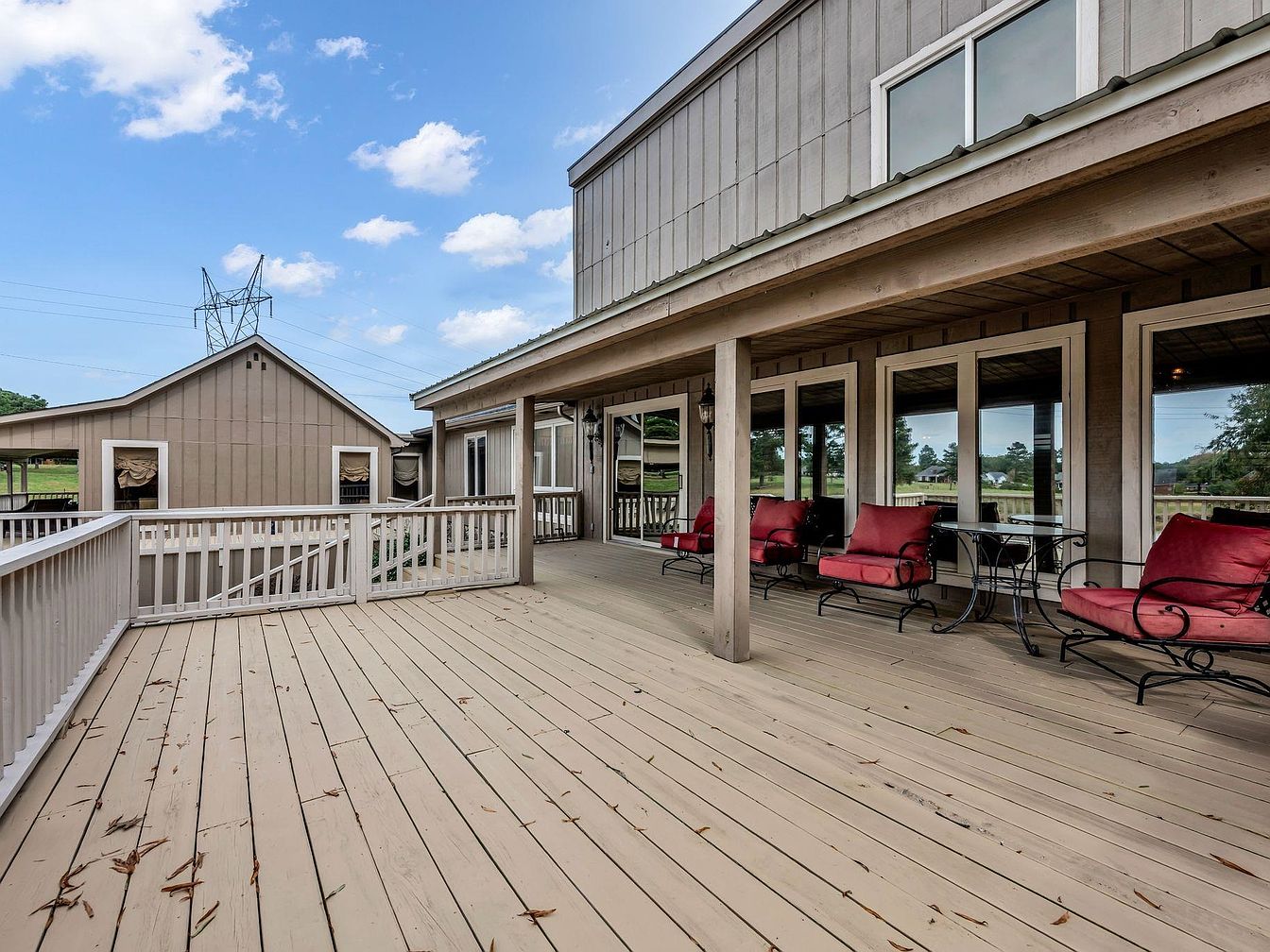 A spacious wooden deck extends across the rear of the home, bordered by classic white railings. The main structure features a series of large windows and glass doors framed in white, providing ample natural light and views of the backyard. Comfortable outdoor furniture with deep red cushions and black wrought iron frames is arranged along the wall, inviting relaxation. The covered section of the deck, supported by sturdy posts and beams in a matching wood finish, offers shaded seating. Neutral taupe siding and clean architectural lines give the exterior a modern yet timeless farmhouse appeal, enhanced by open countryside vistas and bright blue skies.