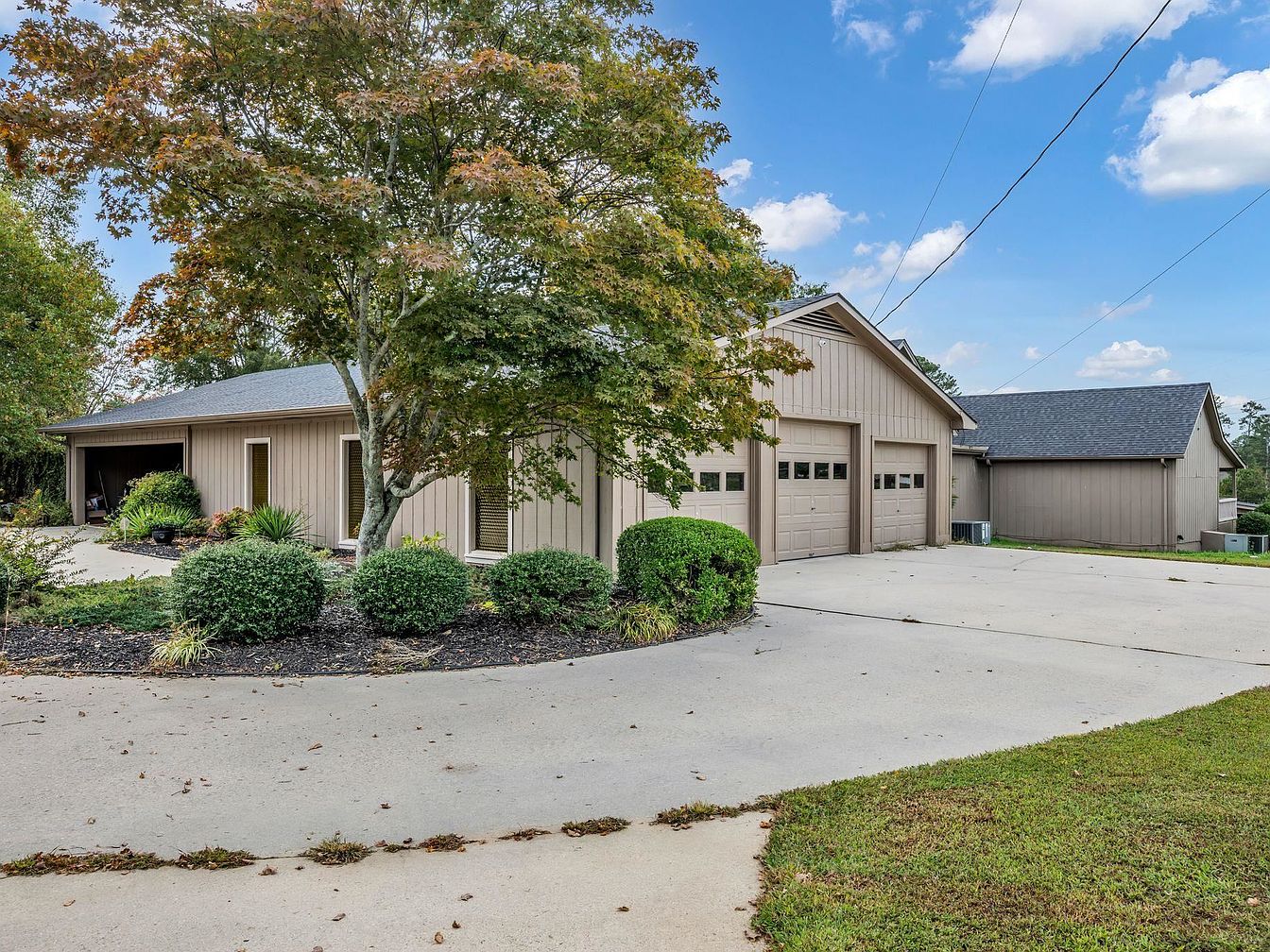 Spacious concrete driveway sweeps toward a large detached garage structure, featuring taupe vertical siding and three garage doors with small upper windows. The roof is covered in dark shingles, intersecting over multiple sections of the building for a layered look. Soft, natural landscaping lines the front, with neatly trimmed green bushes and small ornamental plants surrounded by dark mulch. In the foreground, a mature tree with broad, partially autumn-tinted leaves casts shade, while bright blue sky and scattered white clouds complete the tranquil and tidy suburban setting.