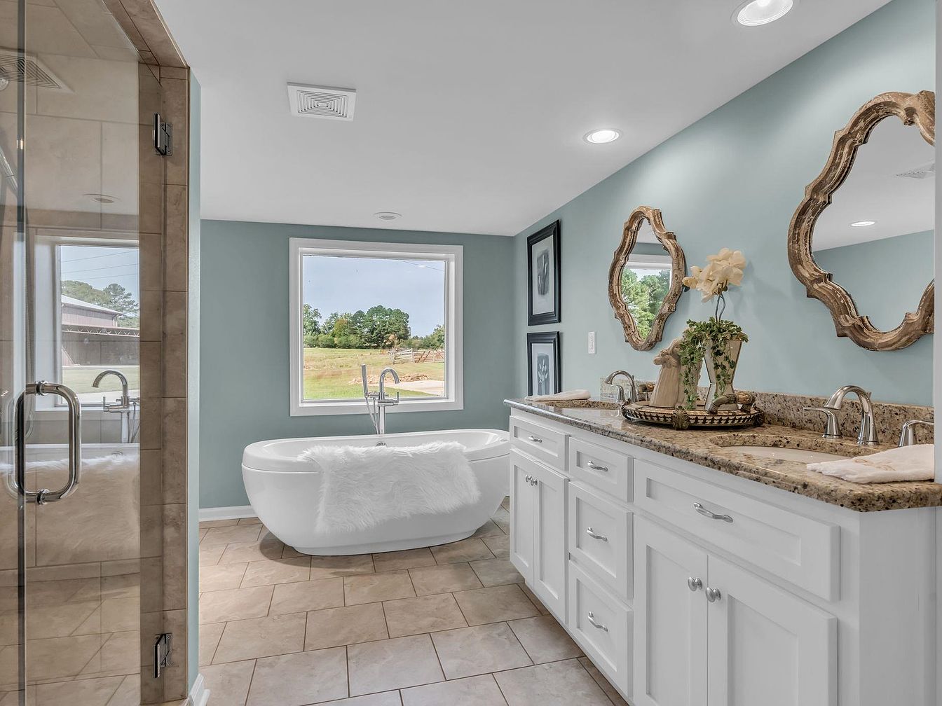 Spacious bathroom featuring a large soaking tub set before a wide window that lets in natural light and offers views of greenery outside. The walls are painted a serene, soft blue, complemented by beige ceramic floor tiles. A glass-enclosed shower sits to the left, while a double-sink vanity with white shaker cabinets and tan granite countertops lines the right wall. Above the vanity are two ornate, gold-toned framed mirrors. Decorative touches include a tray with flowers and greenery, plush towels, and framed black-and-white artwork for a blend of rustic elegance and modern comfort.
