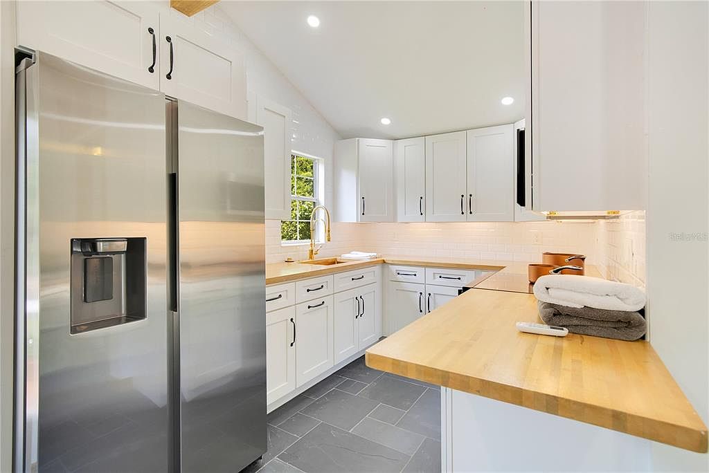 Bright and inviting kitchen space featuring contemporary design elements ideal for family living. White shaker-style cabinets line the walls, topped with sleek black hardware and set beneath soft recessed lighting. The countertops are a warm, light wood tone, providing a comforting natural touch and ample space for meal preparation or gathering. A large stainless steel refrigerator stands adjacent to a sunlit window, which allows natural light to fill the room. Subway tile backsplash adds classic charm, while an uncluttered layout ensures easy movement for family members of all ages. Cozy folded towels add a thoughtful, welcoming detail.
