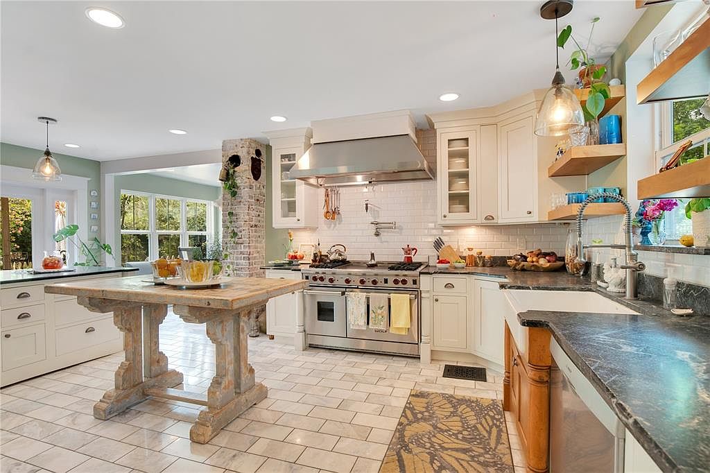 Bright, spacious kitchen designed for family living and easy entertaining, featuring creamy cabinetry and a large farmhouse sink. The rustic wooden center island is perfect for meal prep or gathering for snacks. Sleek black countertops contrast elegantly with white subway tile backsplash, while open shelves display colorful dishes and plants. An industrial stainless-steel stove and range hood provide ample cooking power. Natural light floods in from large windows and French doors, offering a view of the garden and ensuring a cheerful atmosphere. The thoughtfully organized layout and durable surfaces make this kitchen both welcoming and practical for busy family life.